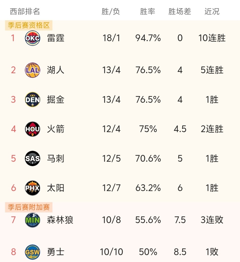 随着火箭104-100险胜勇士,雷霆10连胜,NBA最新积分榜出炉:火箭第4!