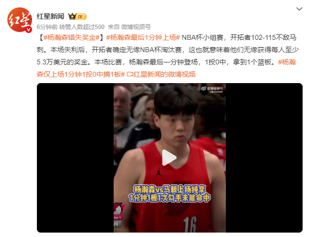 NBA杯小组赛,开拓者102-115不敌马刺。本场失利后,开拓者确定无缘NBA杯淘汰赛,这也就意味着他们无缘获得每人至少5.3万美元的奖金。本场比赛,杨瀚森最后一分钟登场,1投0中,拿到1个篮板。