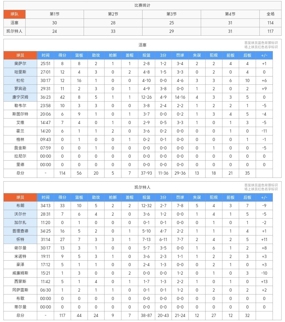 北京时间11月27日,NBA杯赛+常规赛一场焦点之战,最近炙手可热的底特律活塞队客场114-117不敌波士顿凯尔特人,13连胜戛然而止,不过他们依然排在东部第一的位置,此役活塞当家球星康宁汉姆得到42+8+5的数据,杜伦抢到了16个篮板,凯尔特人球星杰伦布朗得到33+10+5,小白怀特砍下27+7+3+3的数据,双方打得火星四射,比赛全场都在对攻,最终凯尔特人险胜对手!
