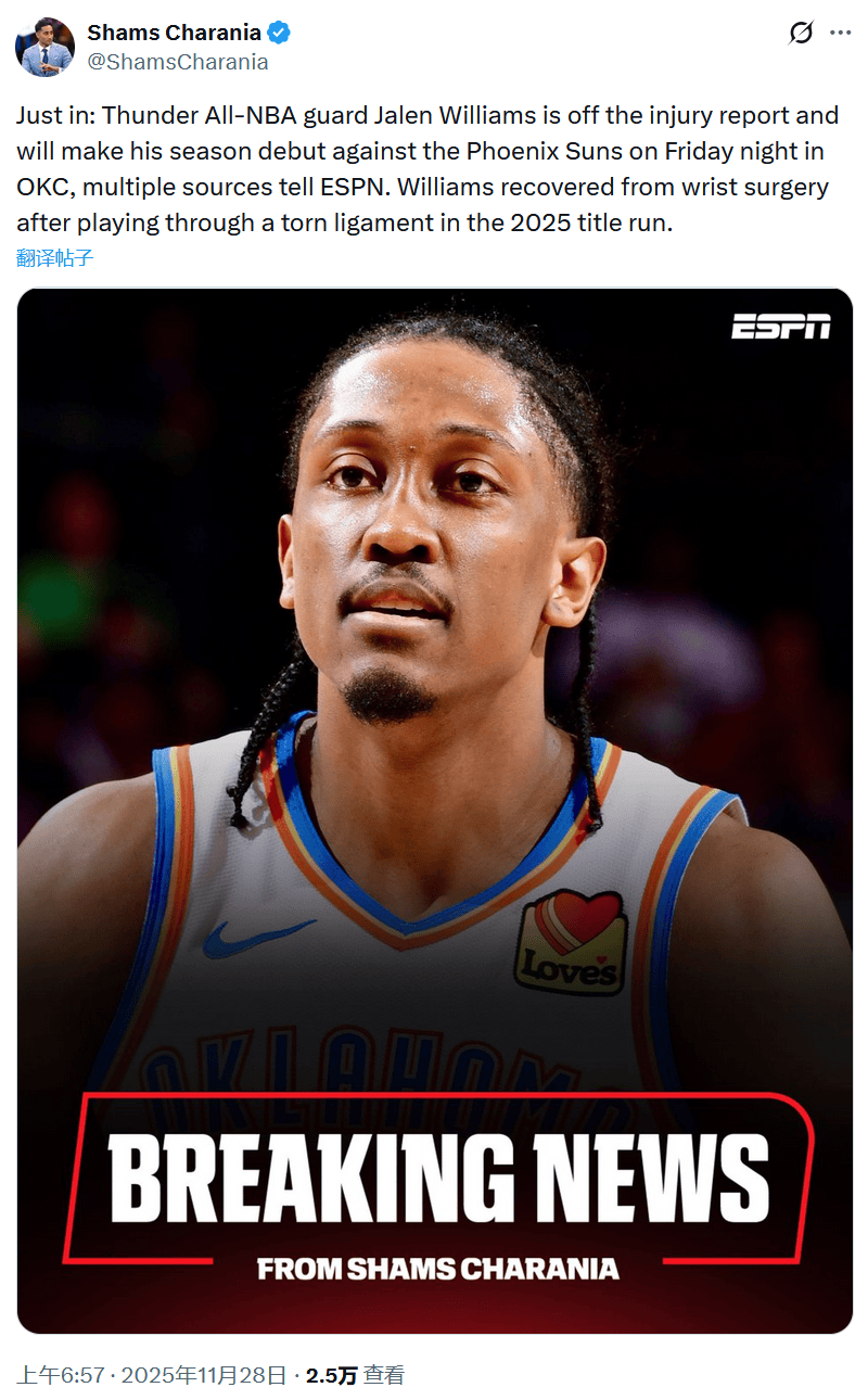 北京时间11月28日,据名记Shams报道称,雷霆队球星杰伦-威廉姆斯将在明天与太阳队的比赛中迎来新赛季首秀。自从上赛季总决赛之后,他还没有出场过。对于18胜1负的雷霆队来说,球队实力再次得到提升。