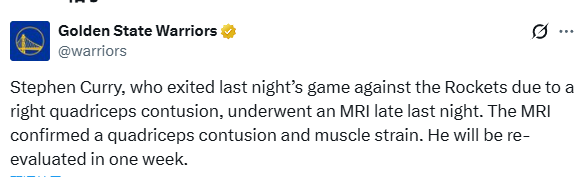 如今库里的核磁检查结果出炉,勇士官方宣布,斯蒂芬·库里昨晚因右股四头肌挫伤退出了对阵火箭队的比赛,他昨晚深夜接受了核磁共振检查。核磁共振结果证实了他的股四头肌挫伤和肌肉拉伤,他将在一周后接受复查。