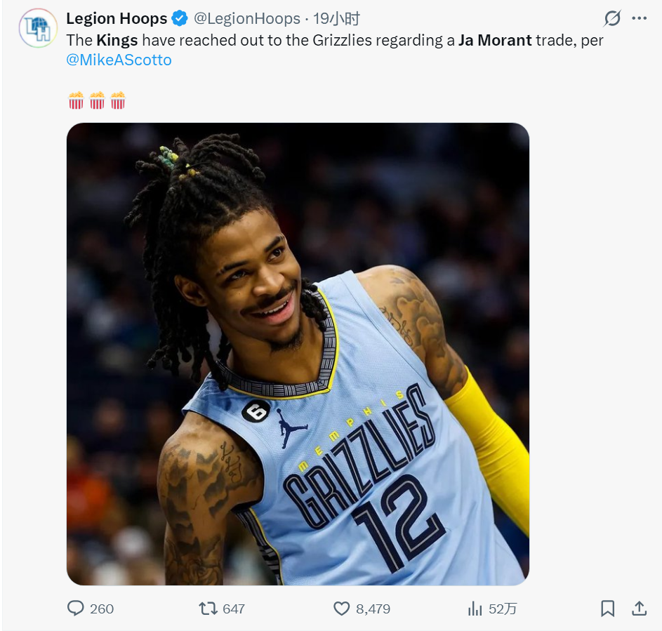 据NBA记者Michael Scotto报道,国王队正式报价莫兰特,拉文、德罗赞和小萨任灰熊选择,但灰熊拒绝了。灰熊认为莫兰特正处在“价值低谷”,所以不着急交易他。而且国王不肯把基根-穆雷放进交易,目前的筹码根本打动不了灰熊。