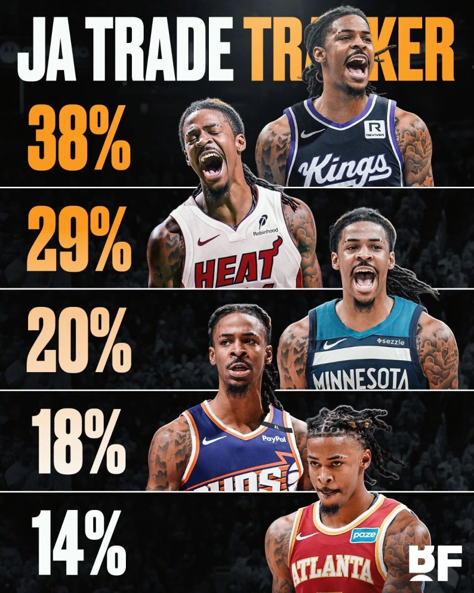 莫兰特潜在下家排行榜:国王38%的概率高居第一;热火29%排名第二;森林狼20%位列第三;太阳18%排第四;老鹰14%排第五。国王着急重建,除了基根-穆雷和克利福德之外,其余国王球员均被摆上货架,问题是不好出手啊!