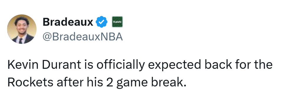 火箭记者Richardson此前表示:“运动员也是人。有时候,他们会遇到一些突发情况,这些情况必须优先于他们的运动。如果杜兰特无故缺席数周,我能理解大家向教练施压。但我们也要负责任地尊重他人的隐私。”