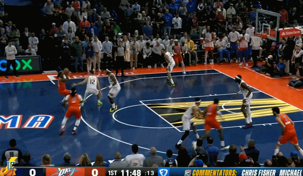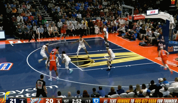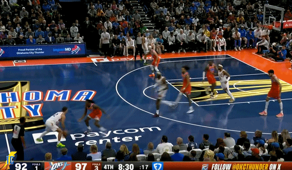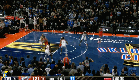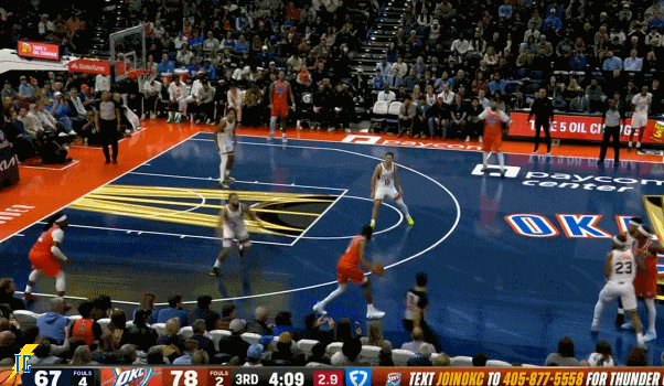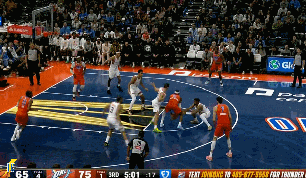杰伦跑出接球位置后卡鲁索刚好一转头没看着,雷霆叫出最后一个暂停!