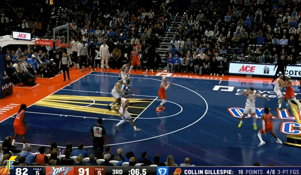 布克两罚不中,SGA依靠罚球得分上双。加拿大人随即卷土重来,制造吉莱斯皮2+1,连续上分!