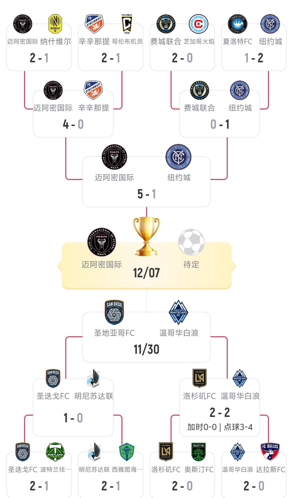 美职联的夺冠模式和NBA有些类似,先打常规赛,然后按照排名确定季后赛名额和对阵,季后赛首轮采取3场2胜制,剩下的比赛全都是单场淘汰制,直到决出最后的总冠军,上赛季迈阿密国际季后赛首轮就遭遇了黑8,爆冷出局!
