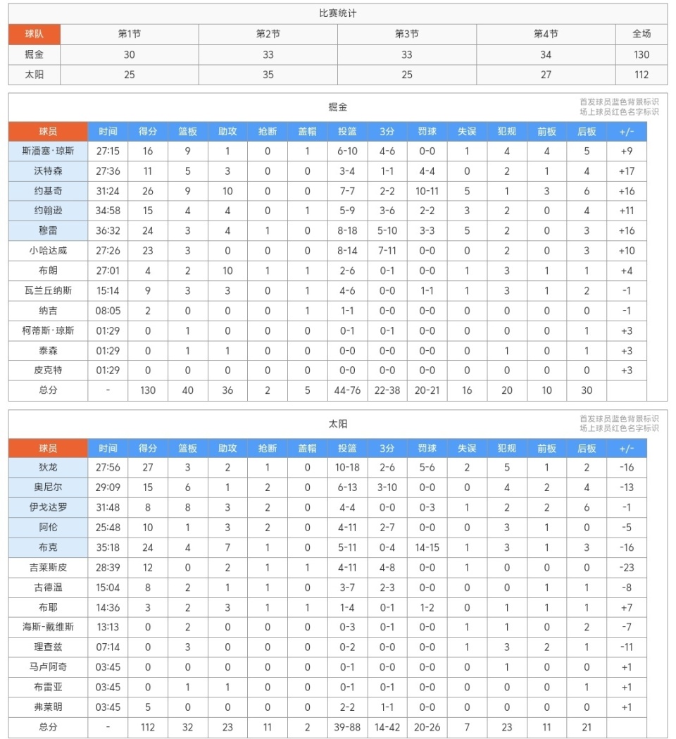 第一节比赛太阳球星布克的个人进攻不太理想,好在狄龙布鲁克斯和伊戈达罗等人比较靠谱,太阳并没有落后太多,掘金队约基奇打满了12分钟,他单节就得到了13+4+3的数据,带领掘金队30-25领先太阳!