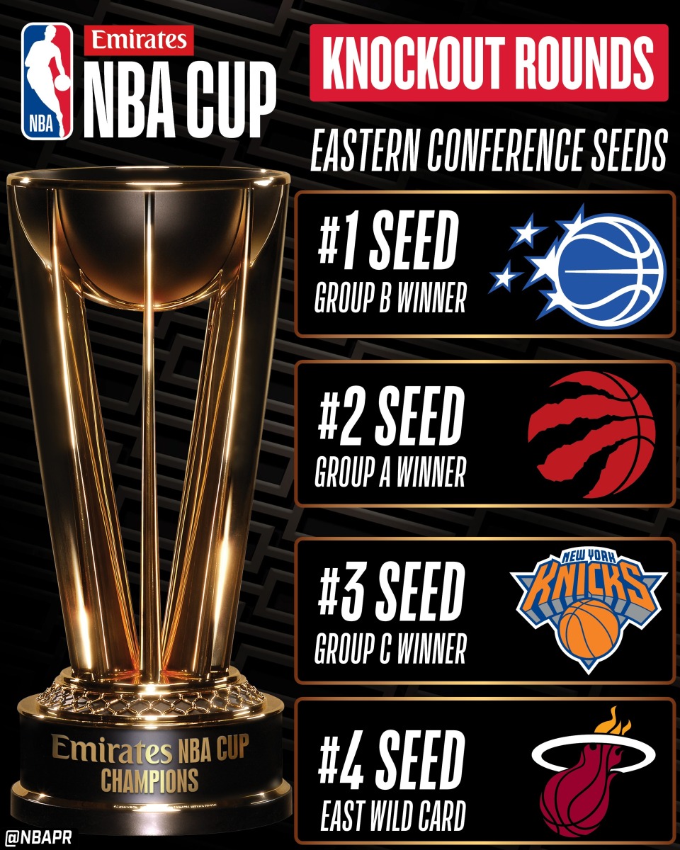 魔术一号种子,猛龙二号种子、尼克斯三号种子、热火四号种子,活塞作为东部第一的球队无缘杯赛八强也挺让人意外。