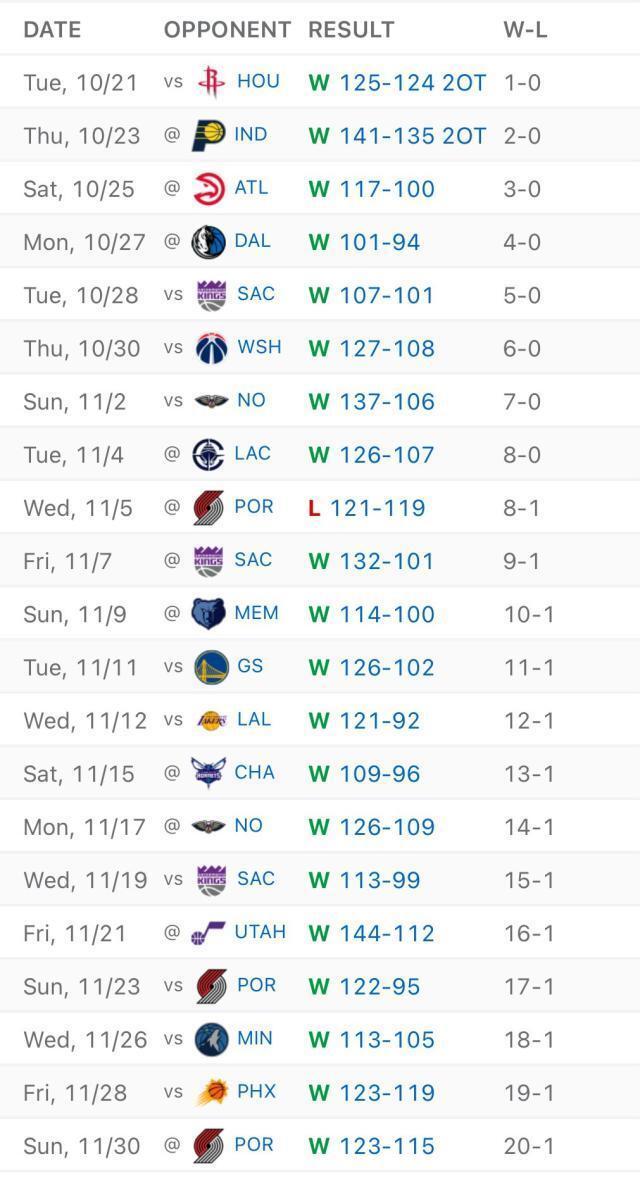 北京时间12月1日,客场面对本赛季唯一击败过自己的开拓者队,雷霆靠着末节的关键球决胜以123比115击败对手,豪取12连胜。此役过后,雷霆本赛季战绩已经来到20胜1负,他们成为了NBA历史第4支开局前21场赢下至少20场的队伍。