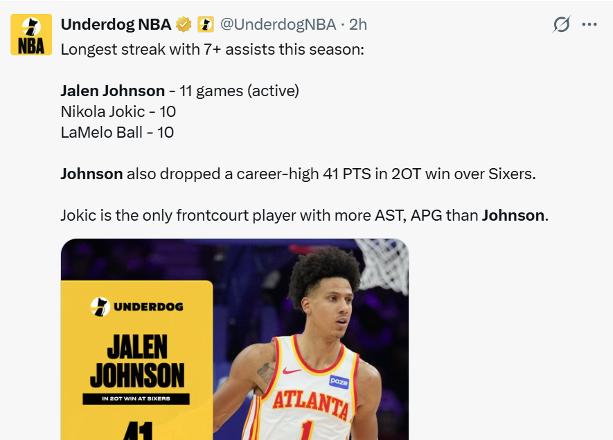 本场比赛再次拿到7次助攻后,杰伦约翰逊已经连续11场比赛交出至少7次助攻,超越约基奇与三球的10场创造新赛季至今联盟最佳纪录。