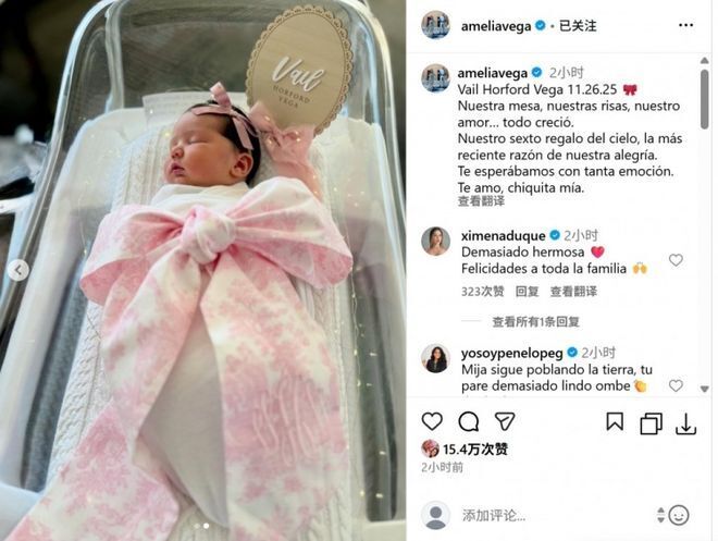 在社交媒体上,阿米莉亚写道:“2025年11月26日,维尔-霍福德-维加出生了。我们的餐桌,我们的欢笑,我们的爱…… 一切都在悄然生长,你是上天赐予我们的第六份礼物,是我们最新的快乐源泉,我们满心期待你的到来。我爱你,我的小宝贝。”
