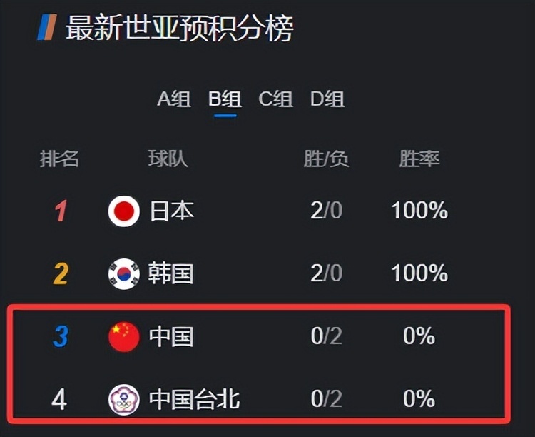 对中国台北一胜,对日本两胜。这样的结局之下,则会出现两种可能性,一是韩国2—0或者1—1中国台北,那么中国台北最好的成绩便是1胜或者2胜,3胜的中国队还是能够100%晋级;