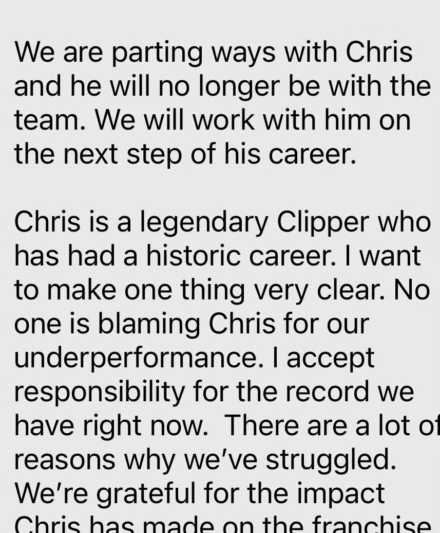 而很快快船官方也发布声明,确认将和保罗分手,他也将不再留在队里。声明称