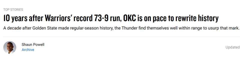 北京时间12月3日,雷霆客场124-112击败勇士,豪取13连胜,赛季至今21胜1负,继续领跑全联盟。关于雷霆的一个火热话题,就是他们能否打破勇士当年73胜的历史纪录?NBA官网也对此展开了分析——