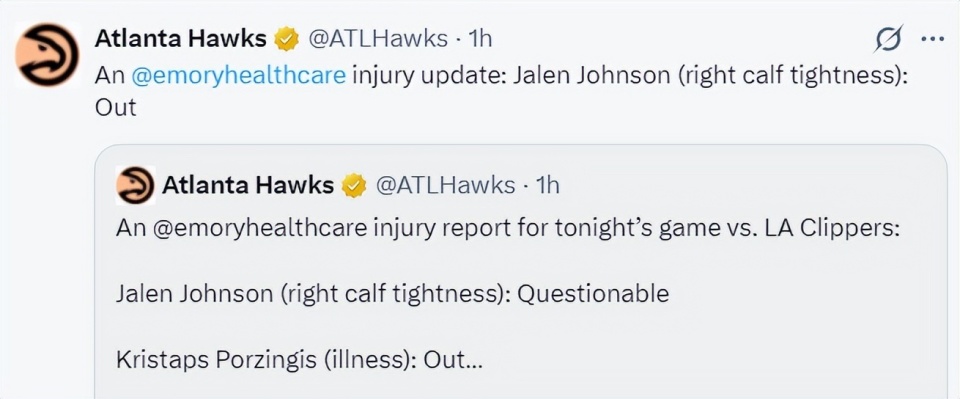 老鹰这边波尔津吉斯、杰伦-约翰逊、特雷杨、托平等人都伤停。