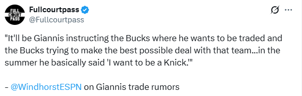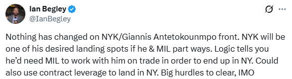 尼克斯记者Ian Begley报道,尼克斯想要引援字母哥的想法从未改变,若他和雄鹿分道扬镳,尼克斯将是他理想的下家之一。从逻辑上讲,他需要雄鹿在交易中配合,才能最终加盟纽约,他也可以利用合同优势来争取加盟纽约,但这其中存在着巨大的障碍。