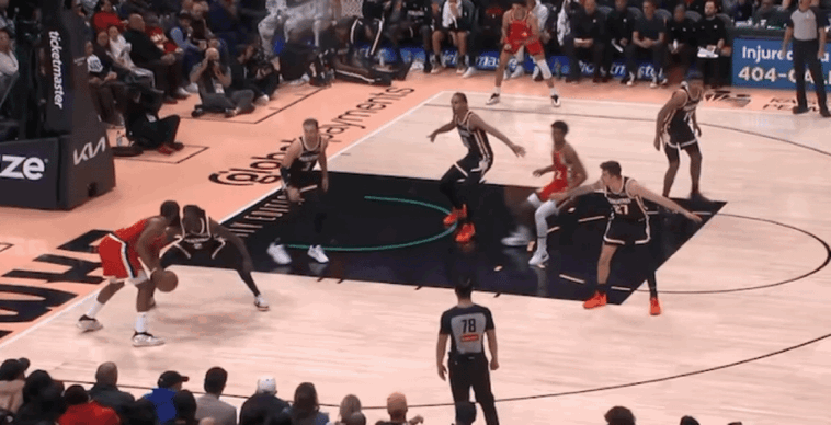 哈登遭到老鹰严防,他持续在进攻端打铁,无法给球队带来有效的运动战进球,这给到老鹰持续迫近分差的机会。但是快船很快就以多点开花回应,哈登妙传祖巴茨暴扣得手,并且突破抛投打进引领快船打出8-0高潮结束本节比赛。上半场结束,快船领先老鹰14分。