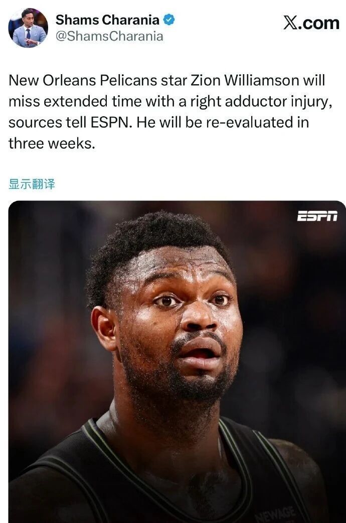 又双叒叕伤了,锡安遭遇右侧内收肌伤势,三周后接受复查。