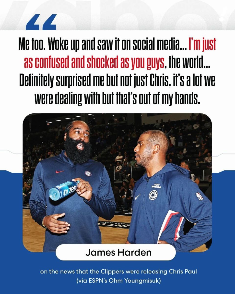 伦纳德表示自己跟哈登一样,是第二天早上从社交媒体得知保罗离队的消息。哈登说:“我睡醒之后才在网上看到这则消息,我和你们一样困惑与震惊。问题绝不只是保罗一人,最近我们要应对的变故太多了,这些都超出了我的掌控。”