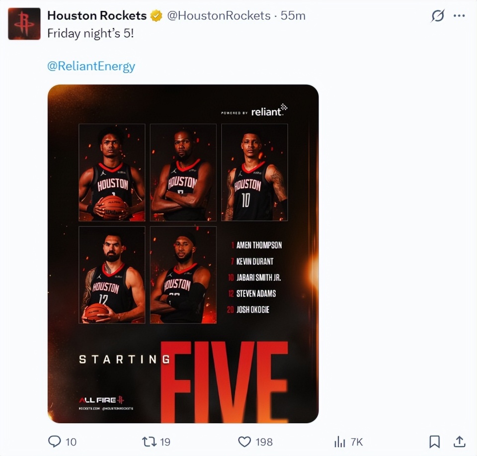 火箭:奥科吉、阿门、杜兰特、史密斯、亚当斯;