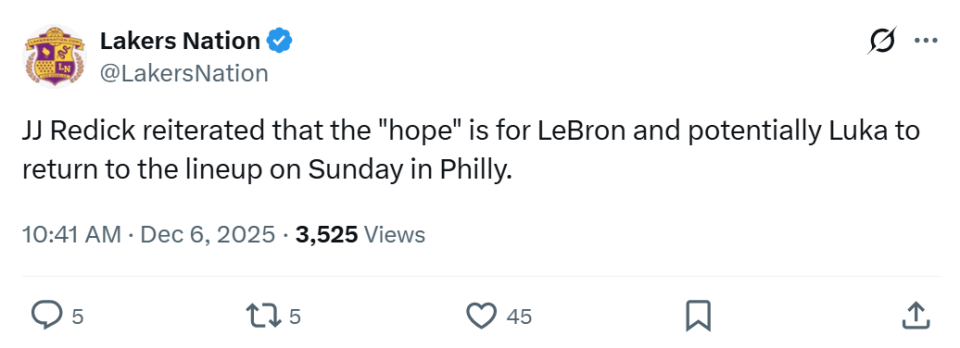 好消息是詹姆斯的问题并不严重,东契奇也即将回归,根据主帅雷迪克赛后透露,詹姆斯与东契奇大概率将在下一场湖人对阵76人队的比赛中回归。