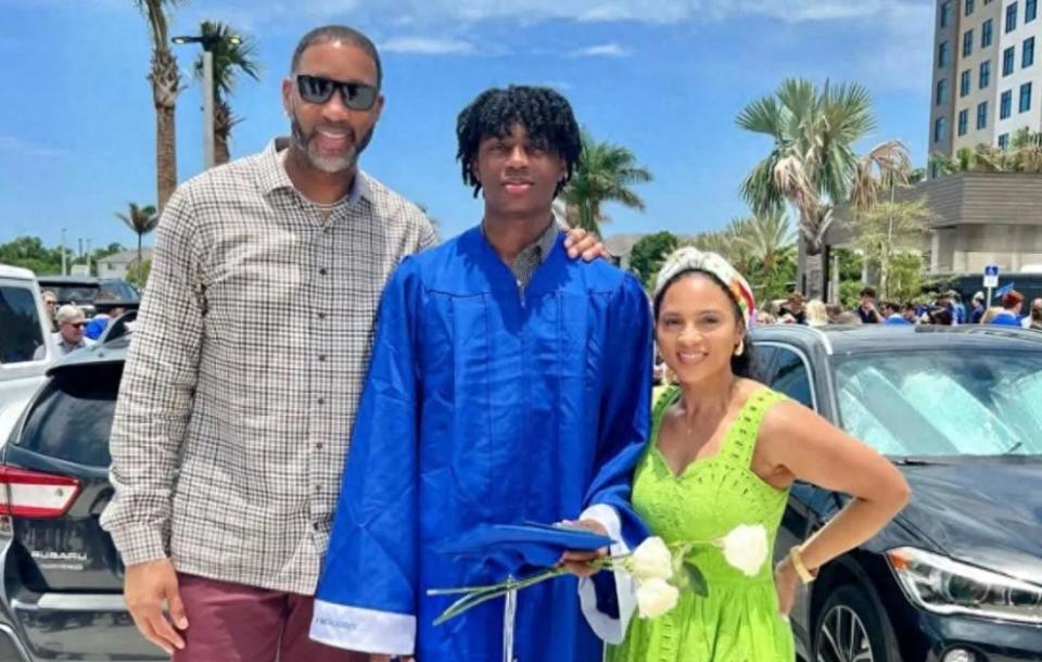 大儿子雷蒙今年20岁,身高1.98米,场上司职得分后卫。他自幼接受父亲的篮球启蒙教育,在父亲的敦促下,球技突飞猛进。高中时,他前往全美排名第一的IMG学院,提升技能,并由知名篮球教练加农-贝克指导基本功。2024年,他参加了由阿迪达斯举办的YMBL锦标赛,贡献23分,三分命中率高达63.6%(11投7中)。他当选了赛事MVP,并帮助球队夺冠。