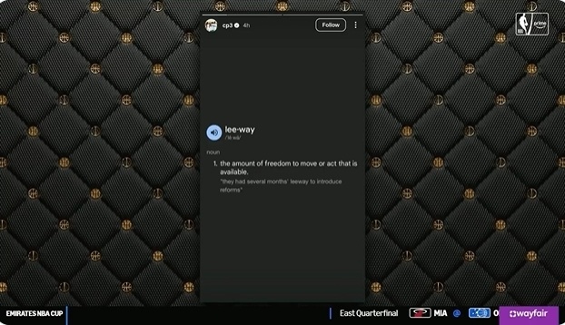 据我所知,杰夫-范甘迪当时明确告诉保罗:“在其他球队你或许有调整防守策略的自主权(leeway),但在这儿,你没有这个权限(leeway)。” 而这只是杰夫-范甘迪与保罗在快船共事这段短暂时间里,数次言语冲突中的一次小摩擦而已。结果,保罗就把leeway这个词的释义晒在了自己的社媒上。