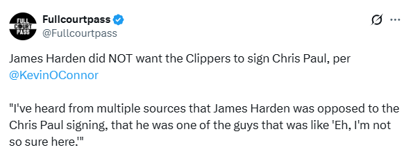 保罗已经不再是快船队的一员,如今名记Kevin O'Connor在节目中爆料,哈登在休赛期并不希望保罗加盟快船,该记者表示:我从多个消息人士那里听说,哈登当时是反对签约保罗的,他是当时几个表态‘这个签约我不太确定……’的态度的人之一。