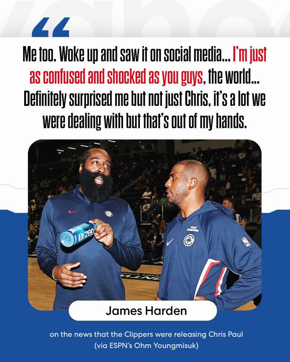 此前谈到保罗离队,哈登表示:我也很意外,我醒来后在社媒看到了(这一消息)......我和你们一样困惑与震惊,全世界都一样;这确实让我猝不及防,但不止是保罗的事,最近我们要应对的变故太多了——只是这些都超出了我能掌控的范围。