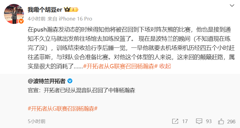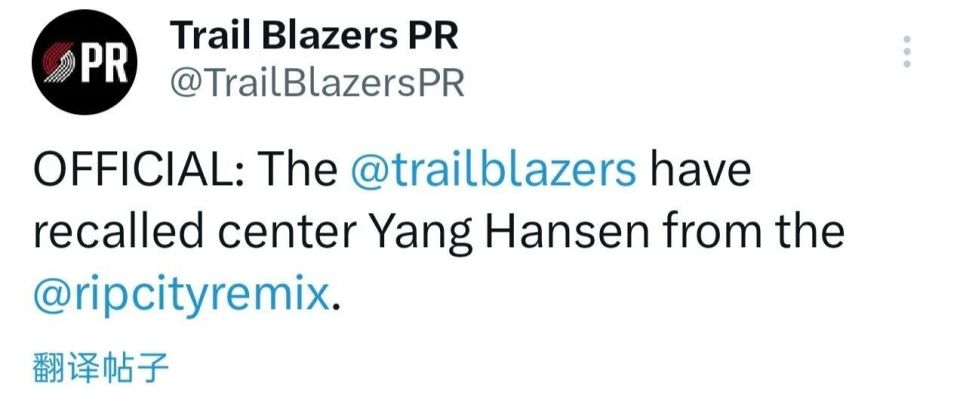 为了应对接下来的可能内线人手紧缺,开拓者不得不放弃让杨瀚森多打几场发展联盟比赛的计划,宣布将他从撕裂之城混音队召回。北京时间12月8日,开拓者将在客场挑战灰熊。