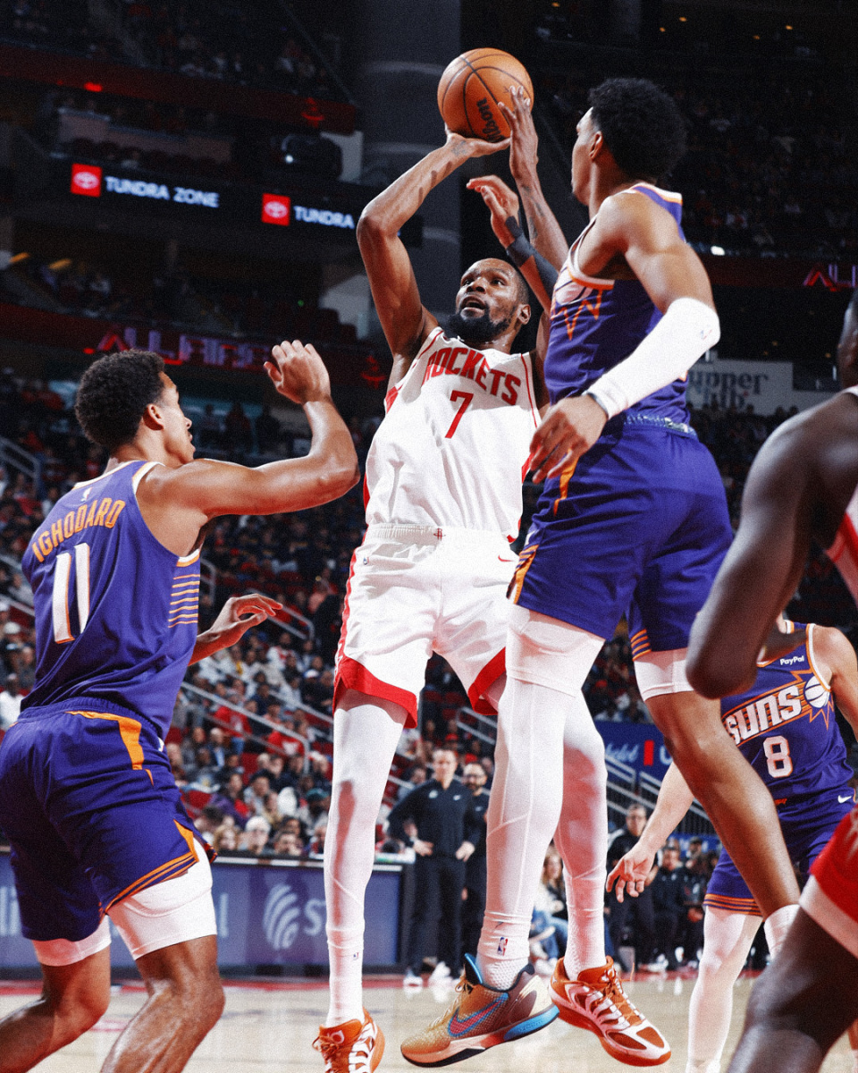 第二节,杜兰特登场后开启杀神模式,外线三分一击即中,连续中投以及突破得分,多次打进不讲理2+1点燃球馆,单节8中7爆砍17分还送出3次助攻,带领火箭单节44-27净胜太阳17分,仅用一节就扭转局面并且拉开分差,半场打完火箭68-58反超10分。