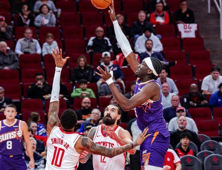 北京时间12月6日,NBA常规赛,火箭坐镇主场迎击太阳。本场比赛之前,火箭14胜5负排名西部第3,作为联盟第一档次的争冠球队。火箭阵容结构太扎实,平均尺寸联盟最高,人人都是攻防一体,他们场均篮板球高达50.3次,断层领跑联盟第一。杜兰特本赛季的数据,相比前几年略有下滑,但是问题不大,场均25分仍能排名全队第一,而火箭其他球员,像申京,阿门,都具备全明星的能力。另一边的太阳队,本场比赛之前,13胜9负排名西部第7,即便休赛期送走了比尔和KD,现在的太阳却依然坚挺,冲击季后赛绰绰有余,新援布鲁克斯这个赛季表现尤其出色。