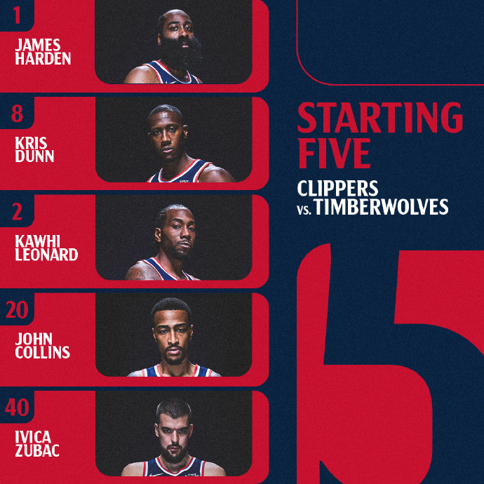 森林狼全员出战,快船迎来博格丹复出,比尔、琼斯与米勒缺席。