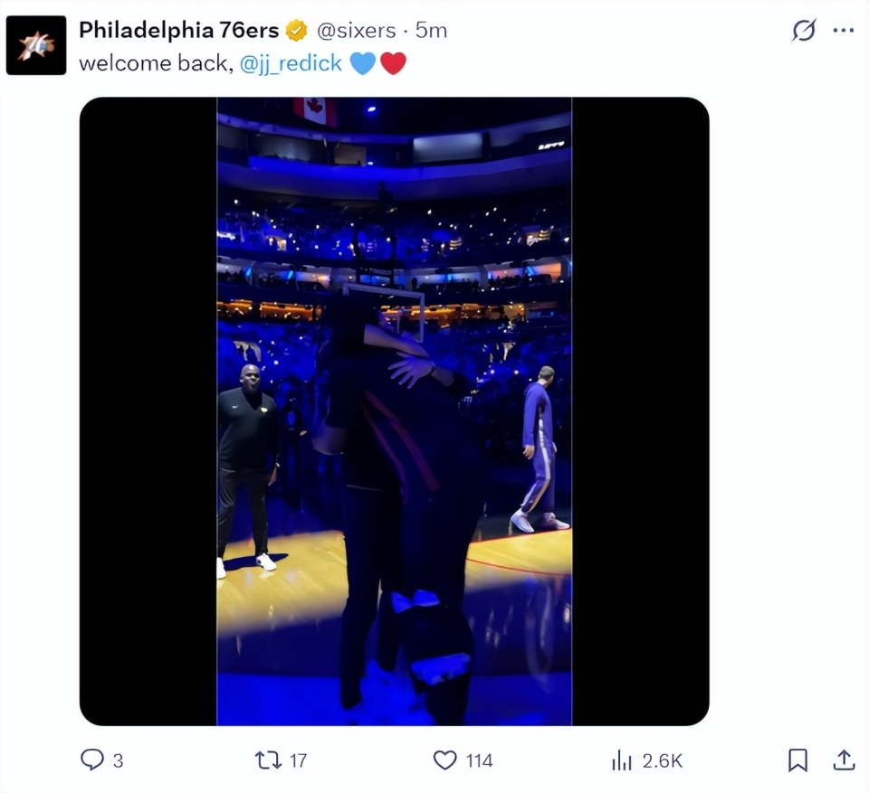76人主场欢迎雷迪克回归,恩比德献上拥抱。