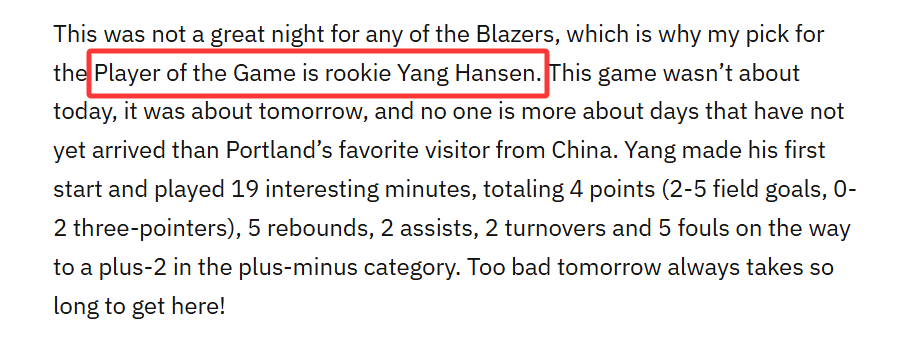 Blazer's Edge的解释是:“对开拓者全队而言,今晚的表现都难言出色,这也是我把本场最佳球员投给新秀杨瀚森的原因。这场比赛的意义本就不在于当下,而在于未来,而在波特兰,没人比这位来自中国的人气新星更能代表球队的未来。杨瀚森此役迎来生涯首次首发,登场19分钟的表现颇具看点:他全场5投2中、三分2投0中,拿下4分5篮板2助攻,同时出现2次失误和5次犯规,正负值为+2。只可惜,未来总是姗姗来迟!”