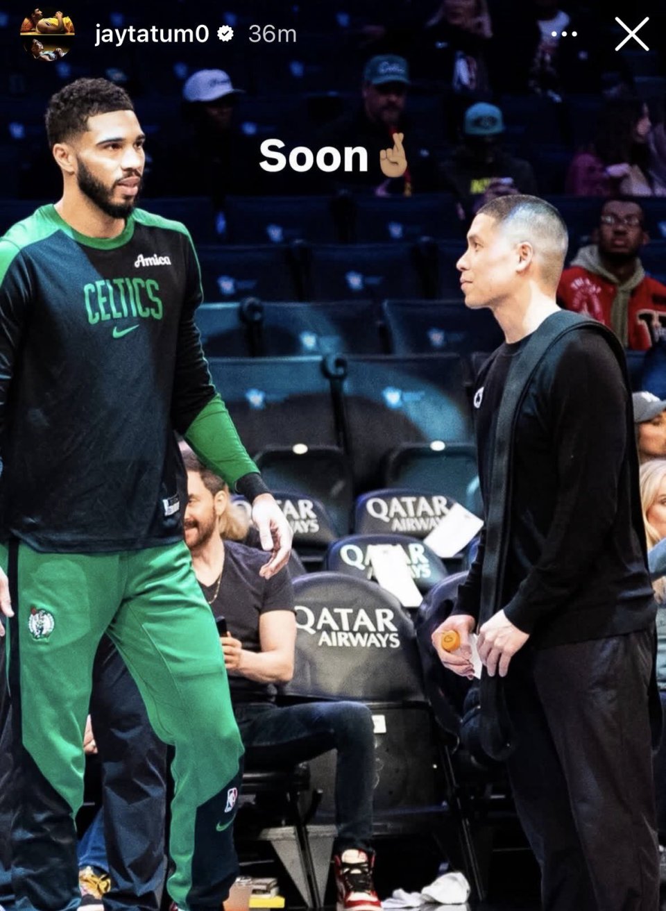 今天早些时候,塔图姆更新社交媒体,他晒出一张自己与训练师的合影,并配上了一个简单的单词:“soon!”结合塔图姆的近期动态,他此举也被看做是暗示自己即将复出。需要说明的是,虽然本赛季暂时不能出战,但是塔图姆几乎一场不落的随队出战,即便是连续客场之旅也从不缺席。
