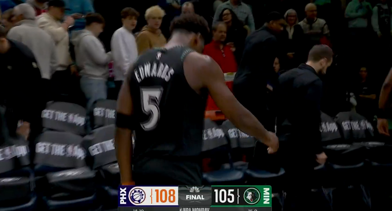 最后2分27秒,爱德华兹犹豫出手导致球队24秒违例,随后华子和兰德尔突破得分,里德错失续命三分,太阳也不得分,比赛还剩8.9秒华子突破上篮追到仅落后1分,吉莱斯皮两罚全中,麦克丹尼尔斯错失绝平三分,最终森林狼输掉比赛,赛后华子第一时间失落离场。