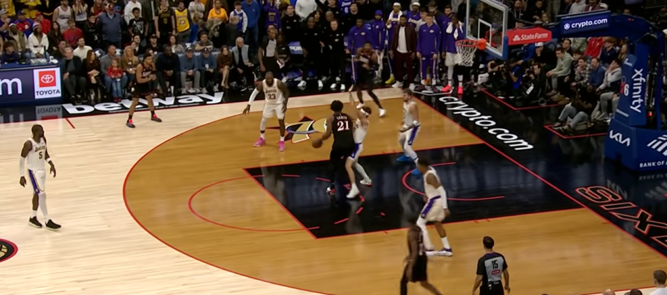 恩比德背身单打里夫斯,恩比德转身中投,恩比德打铁……
