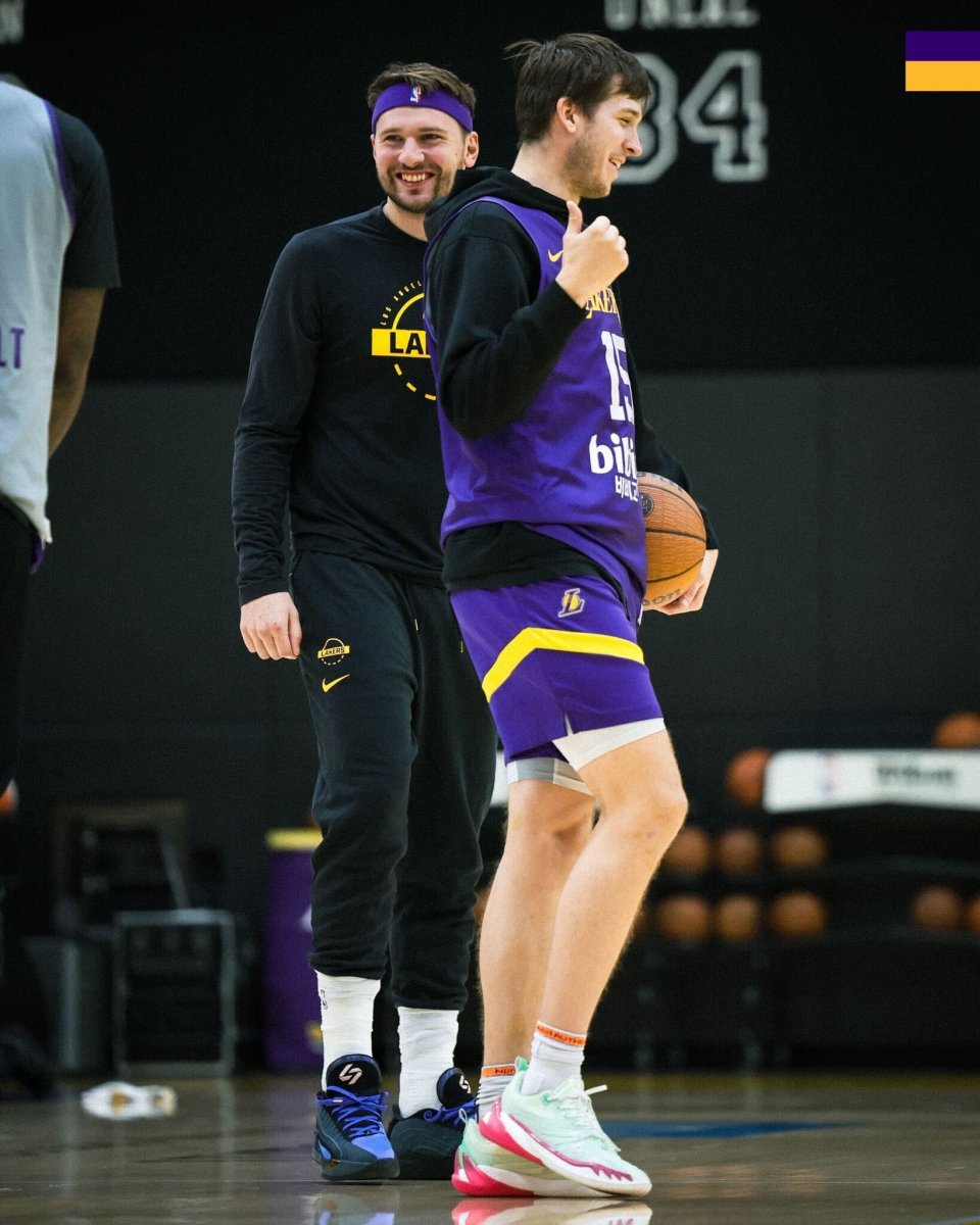 即将41岁的詹姆斯戴着一顶紫色的针织帽,身穿6号训练服,满脸笑容十分开心;东契奇则是戴着发带参加训练,与里夫斯同框出镜,脸上同样写满了开心;八村垒搂着布朗尼,站在场边悠闲聊天。