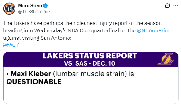 湖人官方已经公布了明天淘汰赛对阵马刺的伤病报告,仅仅克勒贝尔(腰肌拉伤)出战成疑,其他球员都可以出战,詹姆斯、东契奇和里夫斯都可以出战,连续休战6场的斯马特将迎来复出。