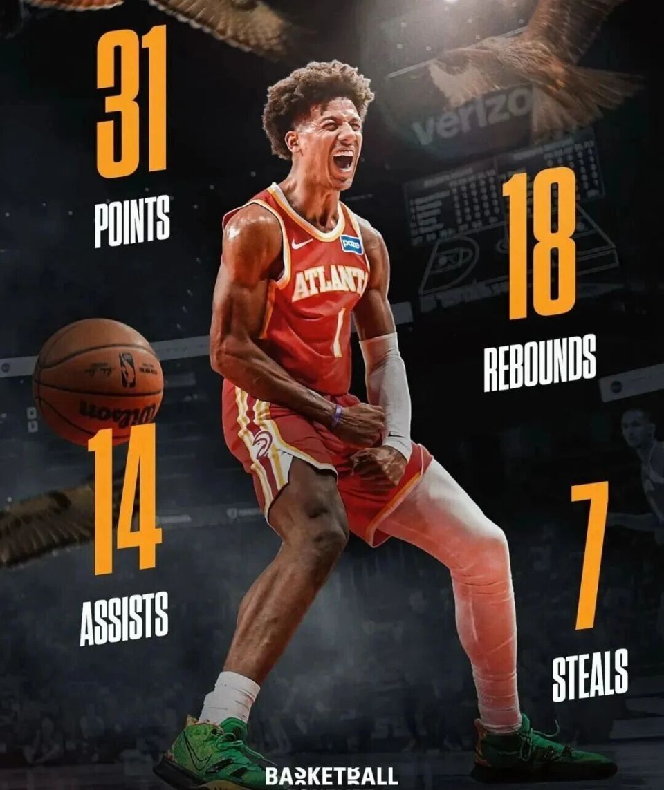年仅23岁的约翰逊,已成长为新鹰王,本赛季至今场均出战35.2分钟,砍下23.4分10.5板7.9助1.6断,投篮命中率53.4%,场均以40.4%命中率扔进1.6记三分球,带领老鹰以14胜11负排名东部第九,可谓是前途无量。
