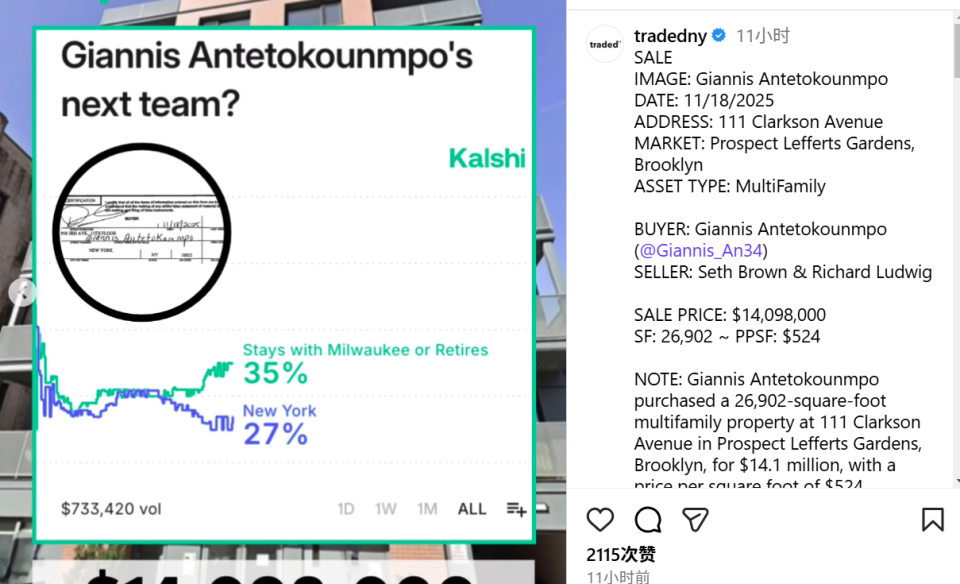 根据美媒Traded报道,字母哥上个月已经在纽约市布鲁克林区的克拉克森大道购入一栋包含28套房的公寓大楼,总面积约2500平方米,价值1410万美元。