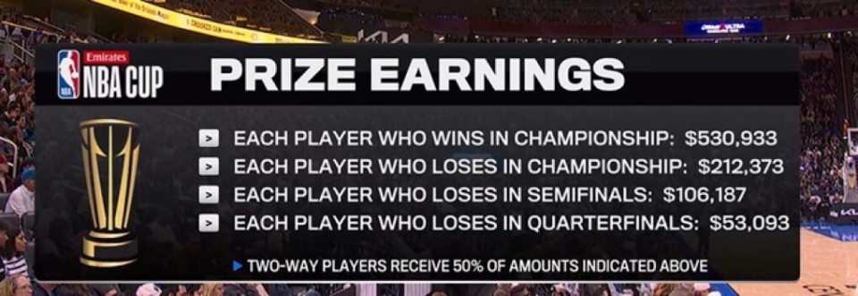 NBA杯奖金安排:晋级淘汰赛每名球员有5.3万美元,冠军53万