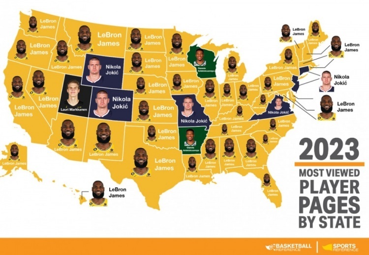 图片显示, BBR2024年美国各州被浏览次数最多的NBA球员也是詹姆斯,没被詹姆斯“占领”的州只有科罗拉多州(约基奇)、威斯康星州(字母哥)和马萨诸塞州(塔图姆)。