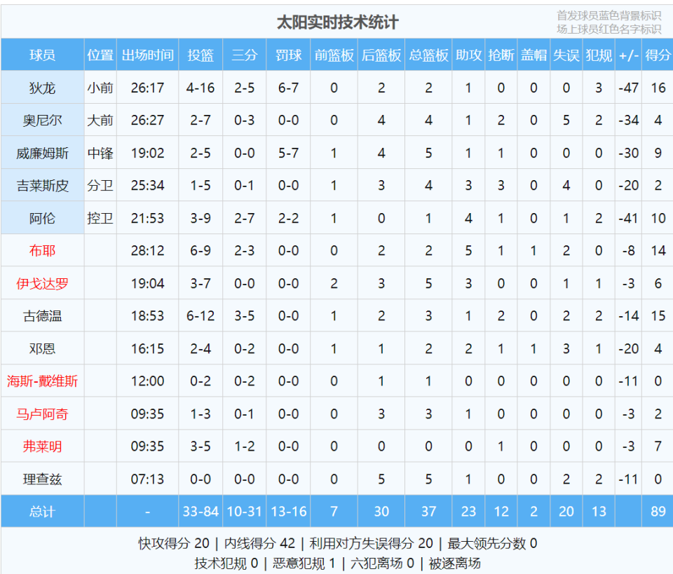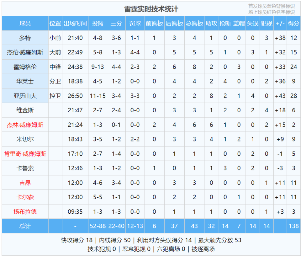 狄龙彻底被锁死,16次出手仅得16分。而且格雷森-阿伦的恶意犯规,激怒了雷霆替补球员。第四节雷霆没有收手,分差越来越大。雷霆两次将分差拉开到53分,距离那个神奇的数字仅差5分。全场结束,雷霆138-89狂胜太阳49分。