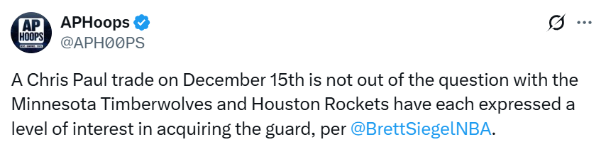 北京时间12月12日,据名记Siegel在播客节目上透露,12月16日完成克里斯-保罗的交易并非不可能——明尼苏达森林狼队与休斯顿火箭队均已表达了对这位后卫的兴趣。