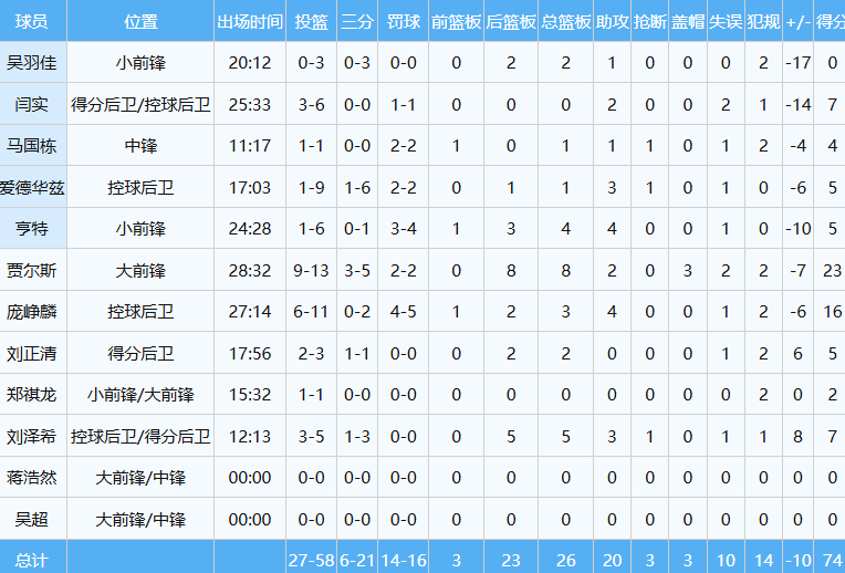 赵睿正式迎来北京队首秀,首发出战约20分钟,投篮9中4,其中三分4中2,贡献10分4助且0失误,正负值+18并列全场第二高,帮助球队84-74拿下赛季开门红。