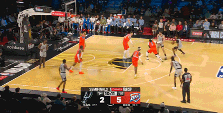 文班亚马第一次登场打了3分多钟,马刺追到仅差4分。马刺不敢让他连续打太久,文班下场之后,雷霆还了一波8-0。上半场最后4分钟,马刺落后到16分,文班重新登场。不仅迎着哈滕飙进三分,而且把雷霆的篮下进攻掐死了。