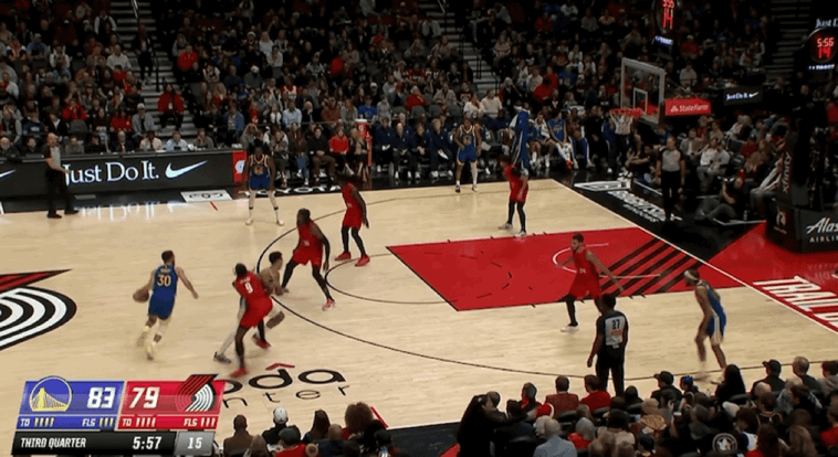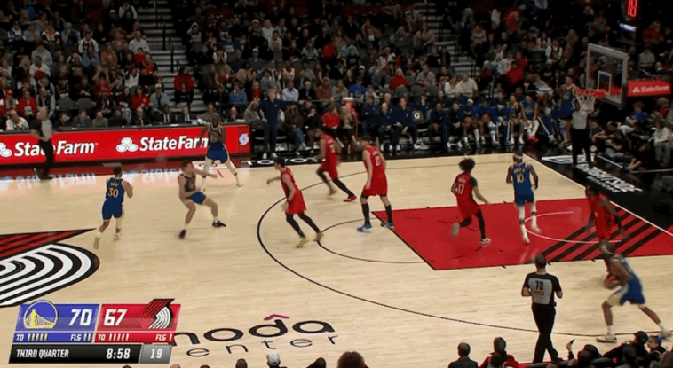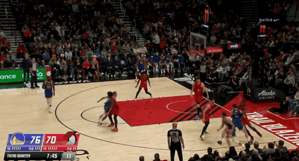 末节比赛,库里延续火热的进攻表现,他先是突破上篮得手,随后造成犯规2罚全中,一人包揽勇士开局前10分,成功为勇士取得双位数领先优势。但是开拓者凭借着格兰特的精准投射,打出一波12-0的进攻高潮予以回应,开拓者又一次顽强地扭转局势。